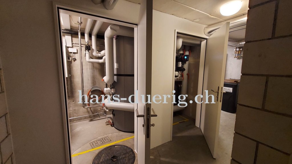 Das Mehrfamilienhaus wurde von der Zentrale im Nachbargebäude abgekoppelt. Die neue Installation besteht aus drei aussen aufgestellten Wärmepumpen von STIEBEL-ELTRON. Die Aufstellung erfolgte auf dem Flachdach. Umwälzpumpen und Ventile sind in einer Installationswand untergebracht. Die Zuleitungen wurden durch das Treppenhaus in die neue Heizungszentrale im Untergeschoss geführt.