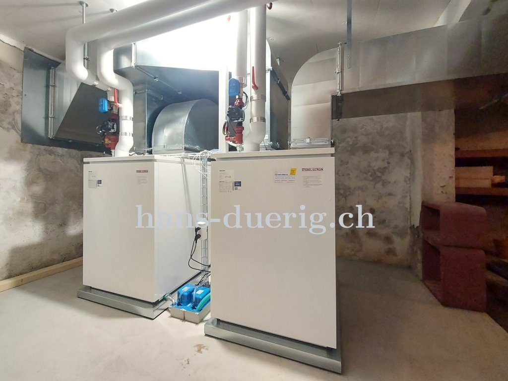Einbau einer Wärmepumpen Kaskade von STIEBEL-ELTRON mit 2 x WPL 24 I für die Raumheizung. Die Lösung konnte gemäss den Anforderungen des Denkmalschutzes realisiert werden.