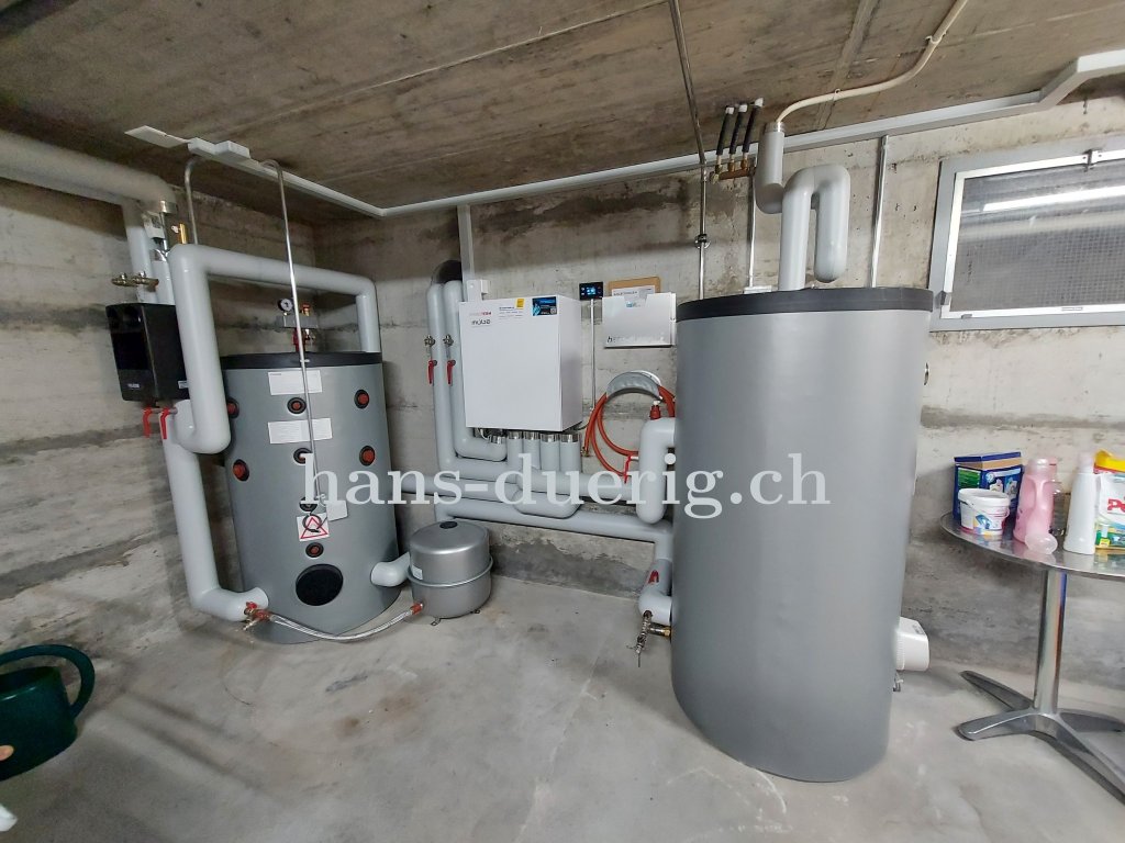 Anstelle des Elektrospeichers wurde ein technischer Speicher und ein separater Warmwasserboiler installiert. Im Hydraulik-Innenmodul ist die Steuerung und das Umschaltventil eingebaut. Die Wärmepumpe wurde an die Fassade angrenzend aufgestellt. Die Zuleitung ist unsichtbar durch ein erdverlegtes Leerrohr gelöst und führt direkt in den Technikraum.