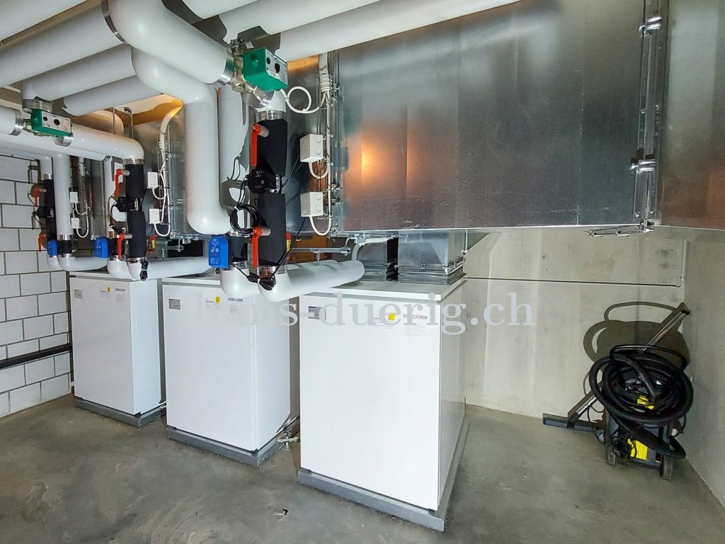 Innen aufgestellte WärmepumpenKaskade mit 3 Wärmepumpen STIEBELELTRON WPL 24 I für ein Mehrfamilienhaus. Die Frischluft wird aus der Einstellhalle angesogen und an der Fassade über je eine separate Ausblasöffnung ins Freie geführt. Die Wärmepumpen dienen für die Raumheizung über die bestehende Bodenheizung und für die Warmwasseraufbereitung. Sie geben die Wärme an einen separaten Boiler oder an den Heizungsspeicher ab.