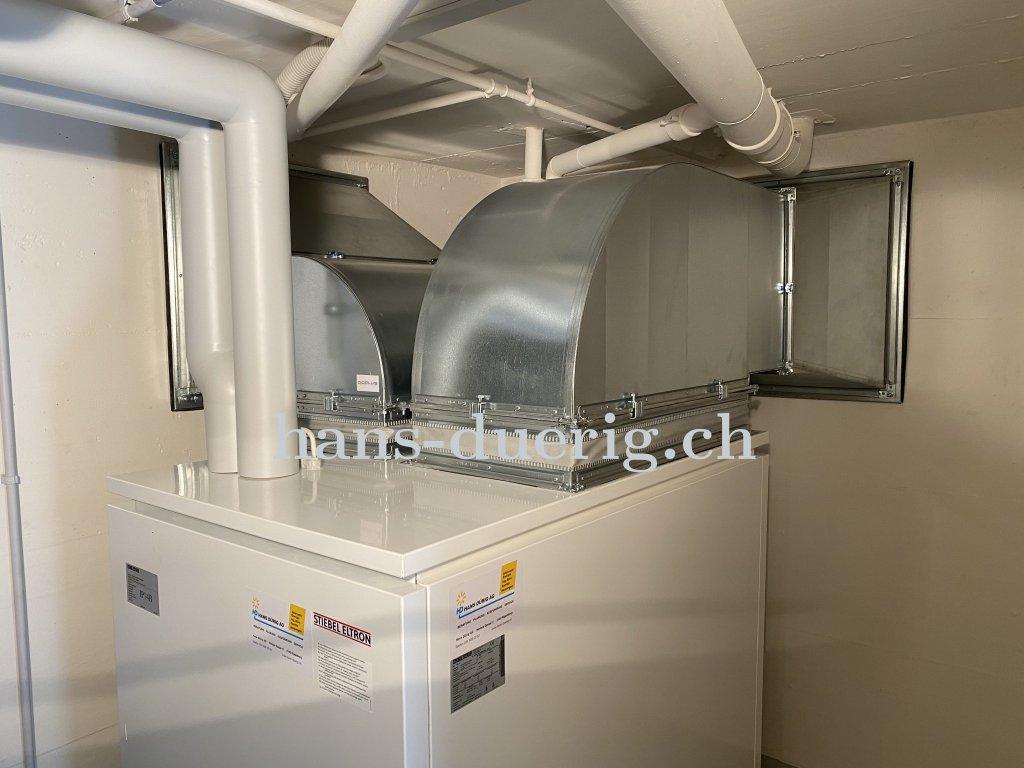 Luft-Wasser-Wärmepumpe Stiebel Eltron Innenaufstellung Typ WPL 19 I mit Kombispeicher HSBM 560 WT1 Installation im ehemaligen Oeltankraum als Ersatz der Oelheizung Zuluft und Abluftkanäle nach Mass gefertigt aus Blech Zuluft und Abluft werden aus neu erstellten Lichtschächten Zu und Abgeführt