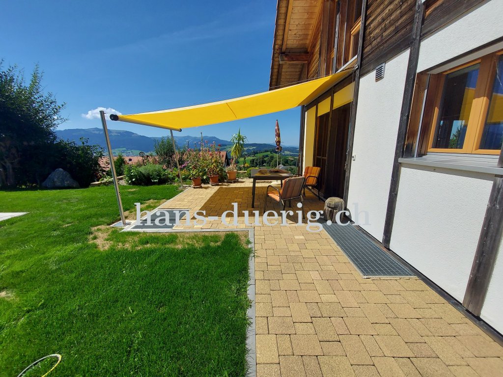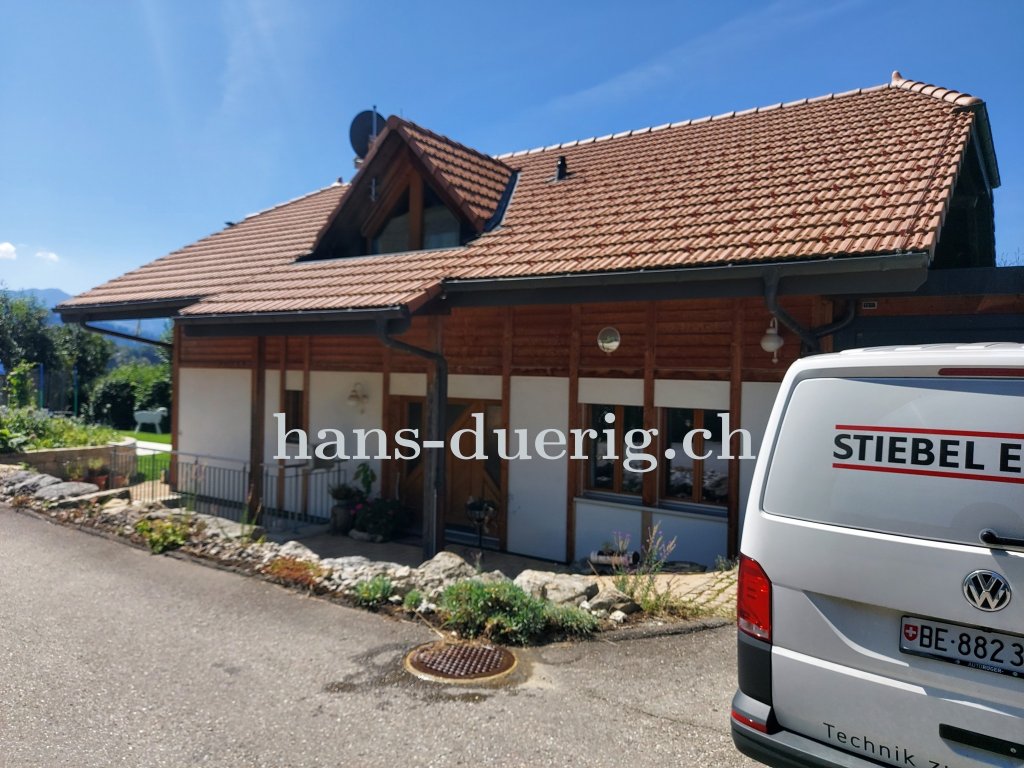 Aufstellung der Wärmpeumpe im Gebäudeinnern. Der bestehende Lichtschacht konnte für die Zuluft genutzt werden. Für die Abluft wurde ein neuer Schacht erstellt, der mit genügend Abstand vom Gebäude weg positioniert wurde, so dass die Trennung von Zuluft und Abluft gewährleistet ist. Die Warmwasseraufbereitung ist im Kombispeicher integriert. Das System ist für den späteren Ausbau mit einer Photovoltaik-Anlage vorbereitet.