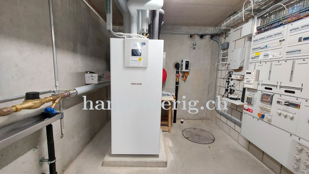 Das Neubauprojekt wurde mit der modernen und sehr kompakten Wärmepumpe WPE-I 33 H 400 von STIEBEL-ELTRON ausgerüstet. Die Wärmepumpe mit Invertertechnik arbeitet mit der Photovolatik-Anlage zusammen und verbessert so den Eigenstromverbrauch. Dazu wurden ein grösserer Warmwasserspeicher (Hygienespeicher) und ein grosser Heizungsspeicher eingesetzt. Zudem verfügt die Wärmepumpe über eine Heissgasnutzung, die erlaubt, den oberen Boilerbereich ohne Effizienzeinbussen auf ca 60°C Warmwassertemperatur aufzuheizen ohne elektrische Zusatzheizung.